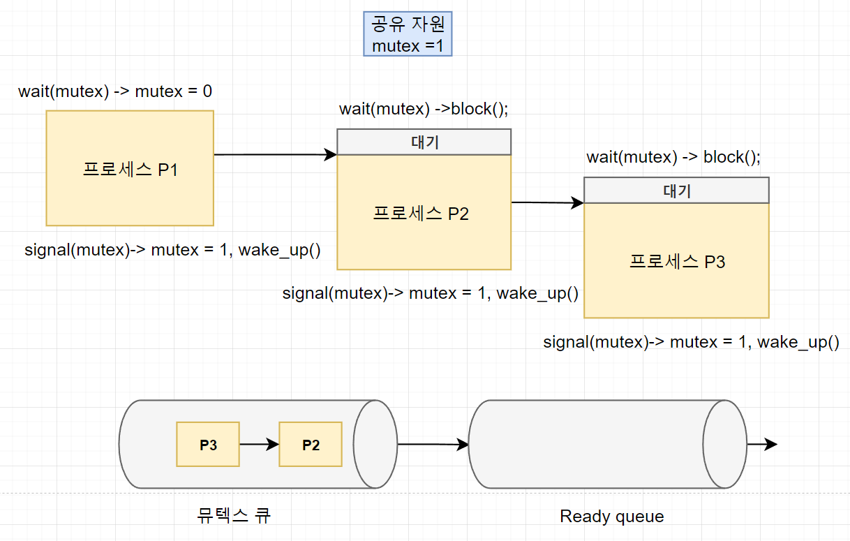 즉, wait을 하면 공유자원 mutex(이전에는 RS)를 하나 감소시키고, signal 하면 mutex를 하나 증가시키고 block 상태에 빠져있는 프로세스를 뮤텍스 큐에서 깨워 ready queue로 보내는 역할을 한다.