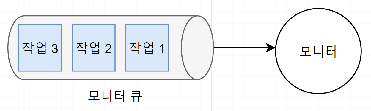 P(),V()를 사용하지 않고 모니터에 작업을 요청한다. - 모니터는 요청받은 작업을 모니터 큐에 저장한 후 순서대로 처리하고 그 결과만 해당 프로세스에 알려준다.