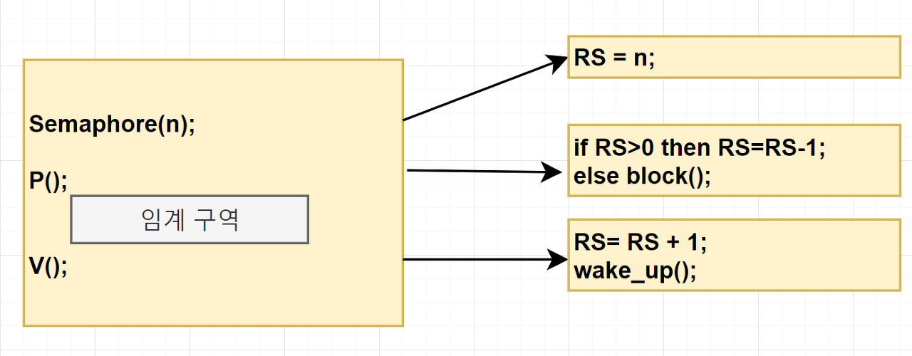 Semaphore(n): 전역 변수 RS를 n으로 초기화한다. RS에는 현재 사용 가능한 자원의 수가 저장된다.P(): 잠금을 수행하는 코드로 RS가 0보다 크면(사용 가능한 자원이 있다면) 1만큼 감소시키고 임계구역에 진입한다. 만약 RS가 0보다 작으면(사용할 수 있는 자원이 없으면) 0보다 커질 때까지 기다린다.V(): 잠금 해제와 동기화를 같이 수행하는 코드로, RS 값을 1 증가시키고 세마포어에서 기다리는 프로세스에 임계구역에 진입해도 좋다는 wake_up 신호를 보낸다.