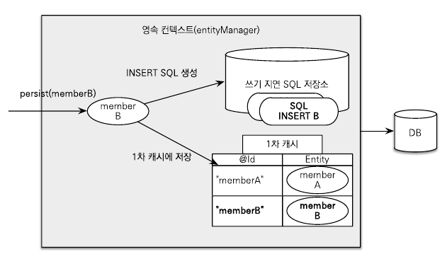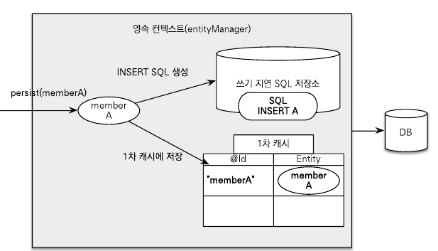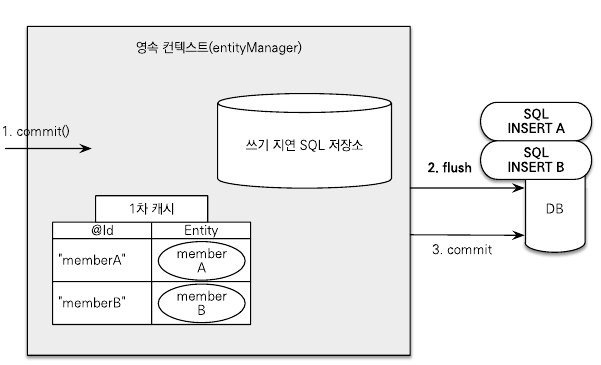 엔티티 매니저는 트랜잭션을 커밋하기 직전까지 데이터베이스에 엔티티를 저장하지 않고 내부 쿼리 저장소에 INSERT SQL을 차곡차곡 모아둔다. 그리고 트랜잭션을 커밋할 때 모아둔 쿼리를 데이터베이스에 보내는데 이것을 트랜잭션을 지원하는 쓰기 지연(transactionla write-behind)이라 한다.