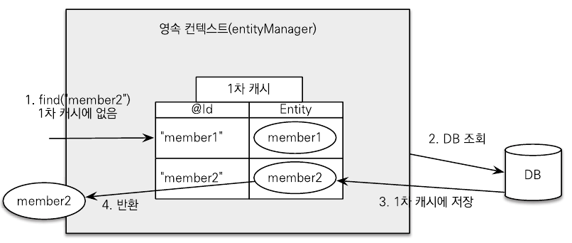 em.find(Member.class, "member2")를 실행한다.- member2가 1차 캐시에 없으므로 데이터베이스에서 조회한다.