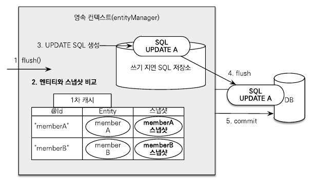 - 변경된 엔티티가 있으면 수정 쿼리를 생성해서 쓰기 지연 SQL 저장소에 보낸다.