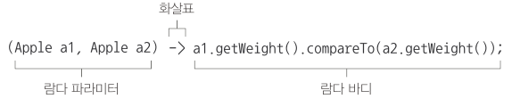 - 람다 바디 : 두 사과의 무게를 비교한다. 람다의 반환값에 해당하는 표현식이다.
