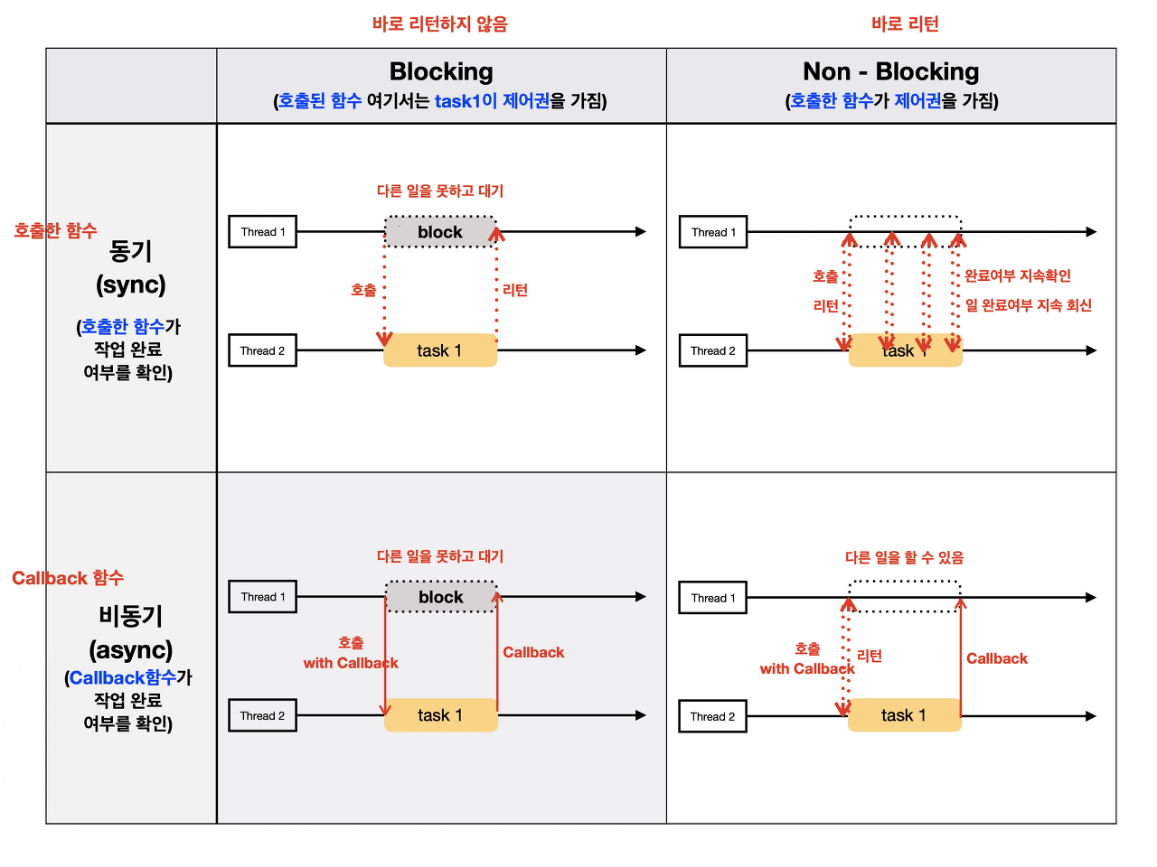 즉, 호출을 한 함수는 제어권을 받지 못해 대기하고 있고 호출된 함수는 작업 완료 여부를 작업이 끝났을 때 알려주게 된다.