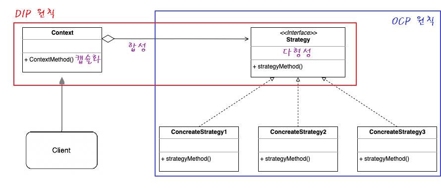 사실 전략 패턴은 SOLID 원칙의 OCP원칙, DIP원칙과 합성(composition), 다형성(polymorphism), 캡슐화(encapsulation) 등 OOP 기술들의 총집합 버전이라고 보면 된다.
