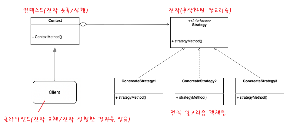 - 클라이언트 : 특정 전략 객체를 컨텍스트에 전달 함으로써 전략을 등록하거나 변경하여 전략 알고리즘을 실행한 결과를 누린다.