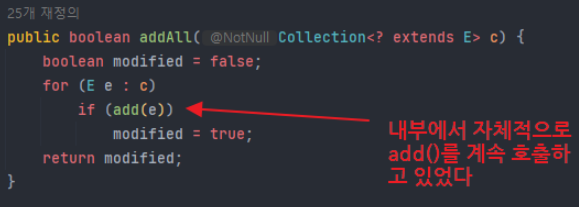 문제는 부모의 addAll() 메소드를 함부로 오버라이딩 한채 super 키워드로 호출했기 때문이다.