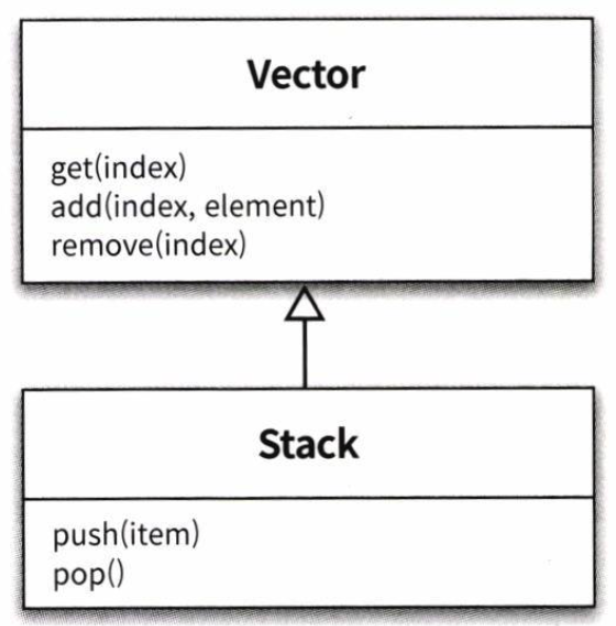 예를 들어 Stack의 대표적인 동작은 push, pop 이지만 상속한 Vector 클래스의 add 메소드 또한 외부로 노출되게 된다.
