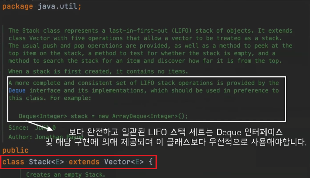 따라서 자바 공식 문서에 보면 애초부터 상속을 잘못하여 잘못 설계된 Stack 클래스보다 Deque 클래스를 사용하여 구현할 것을 권장하고 있다.
