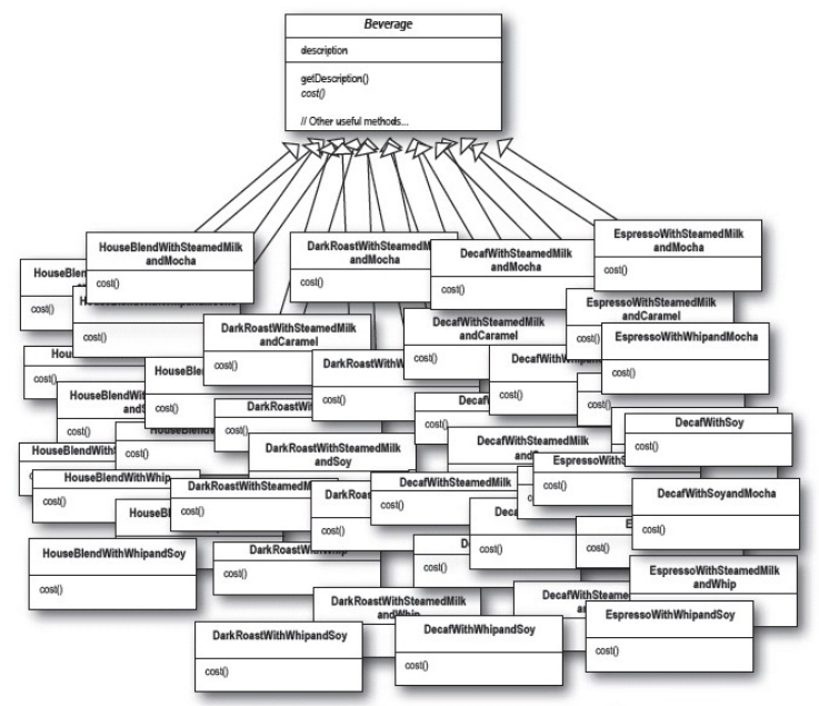 따라서 여러 기능을 조합해야 하는 설계에 상속을 이용하게 된다면 모든 조합별로 클래스를 하나하나 추가해주어야 한다.
