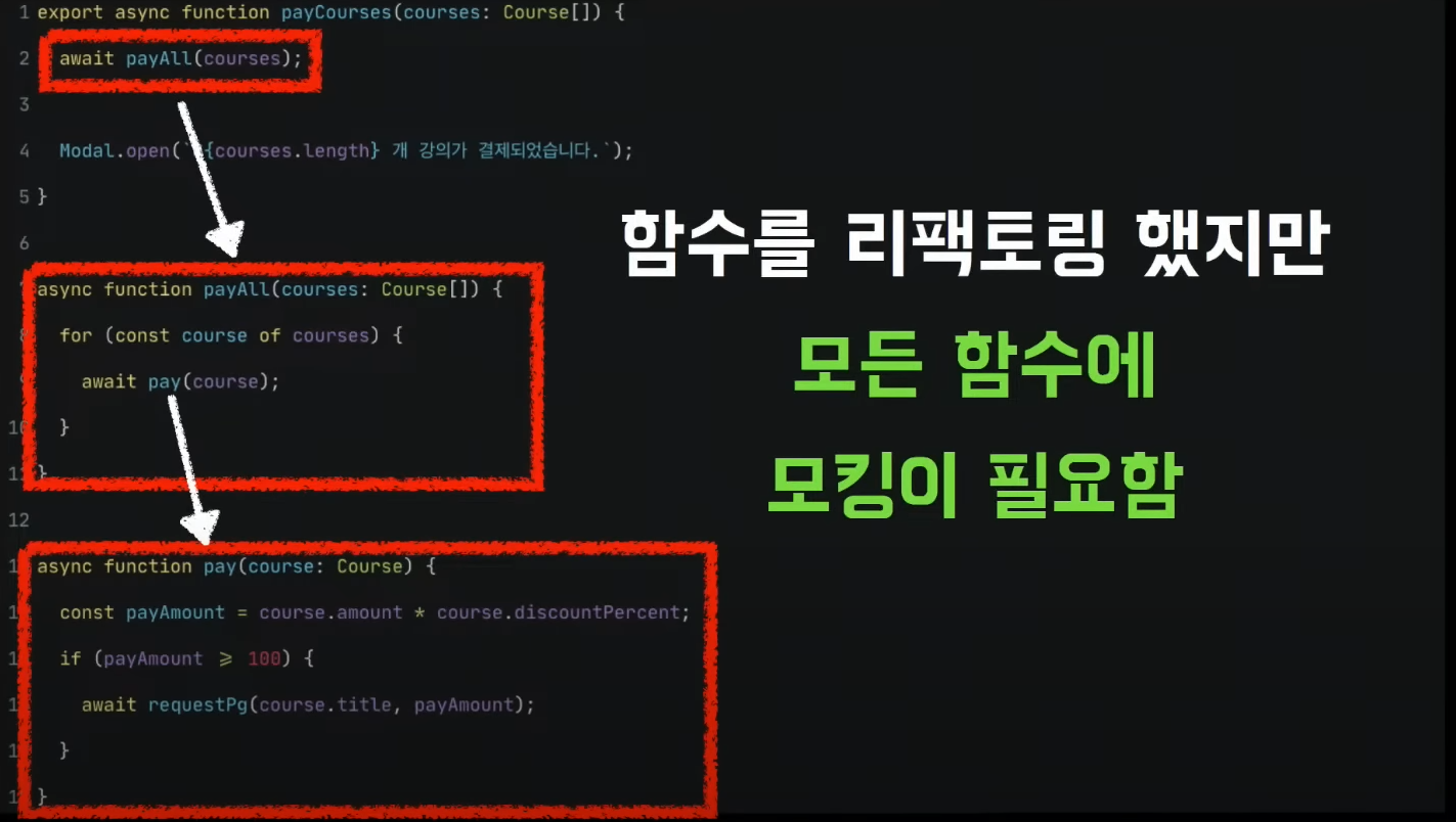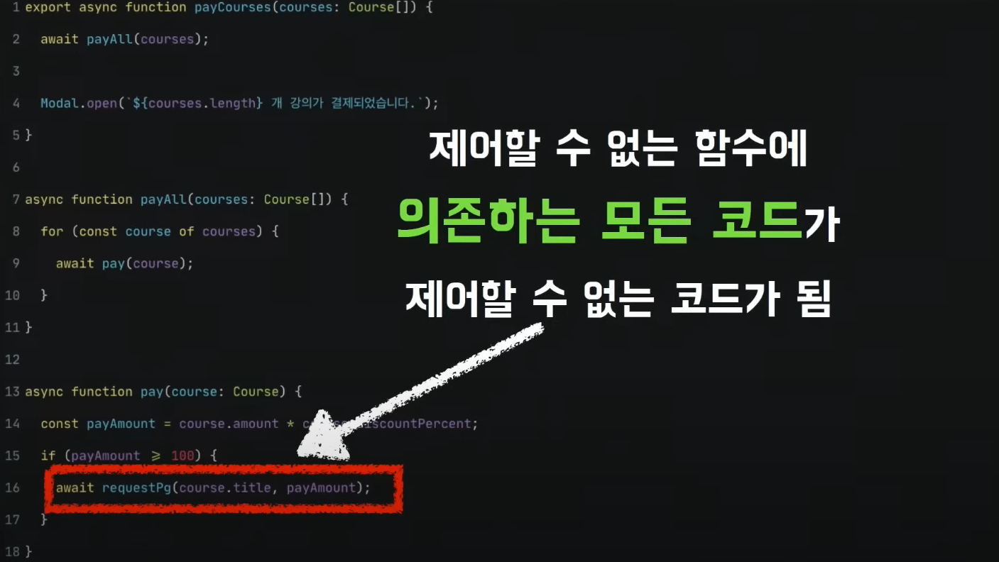 그 이유는 requestPg()라는 외부 API를 호출하는 제어할 수 없는 함수에 전염이 되어서 모두 제어할수 없는 코드가 되어버렸기 때문이다.