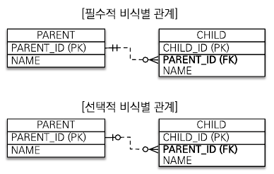 데이터베이스 테이블을 설계할 때 식별 관계나 비식별 관계 중 하나를 선택해야 한다.