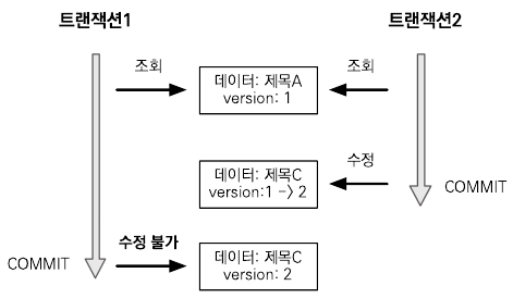 - 트랜잭션 1이 데이터를 제목 B로 변경하고 트랜잭션을 커밋하는 순간 엔티티를 조회할 때 버전과 데이터베이스의 현재 버전 정보가 다르므로 예외가 발생한다.