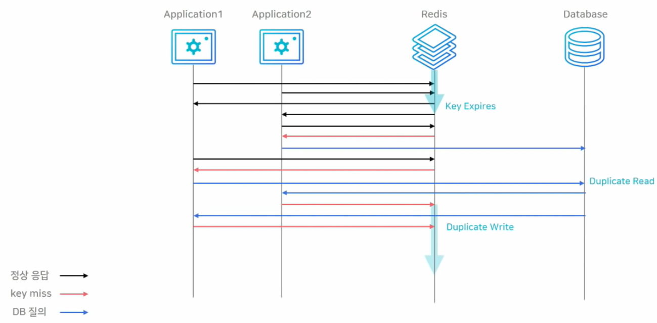 그런데 key가 만료되는 순간 많은 서버에서 이 key를 같이 보고 있었다면 모든 어플리케이션 서버에서 DB로 가서 찾게 되는 duplicate read가 발생한다.