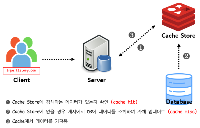 - 데이터를 찾을 때 우선 캐시에 저장된 데이터가 있는지 우선적으로 확인하는 전략. 만일 데이터가 없으면 DB에서 조회함.